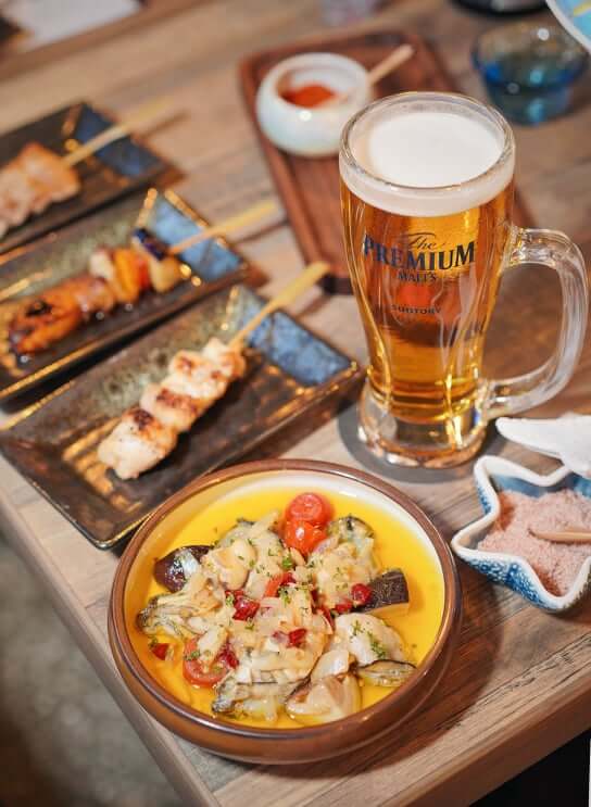 除了新鮮牡蠣外,主廚同樣推出多樣化嘅菜式,包括燒牡蠣、串燒及小食等供客人選擇。串燒有14款,包括雞肉、鴨肝、牛肉、豚肉及蔬菜。其中佐賀縣產三瀨雞腿肉及熊本縣產雞脛柳更是招牌串燒,佐賀縣產三瀨雞係以法國雞和日本地雞混種培養,脂肪少而富有彈性,肉質嫩滑細膩,經過燒烤更能感受肉汁流淌。