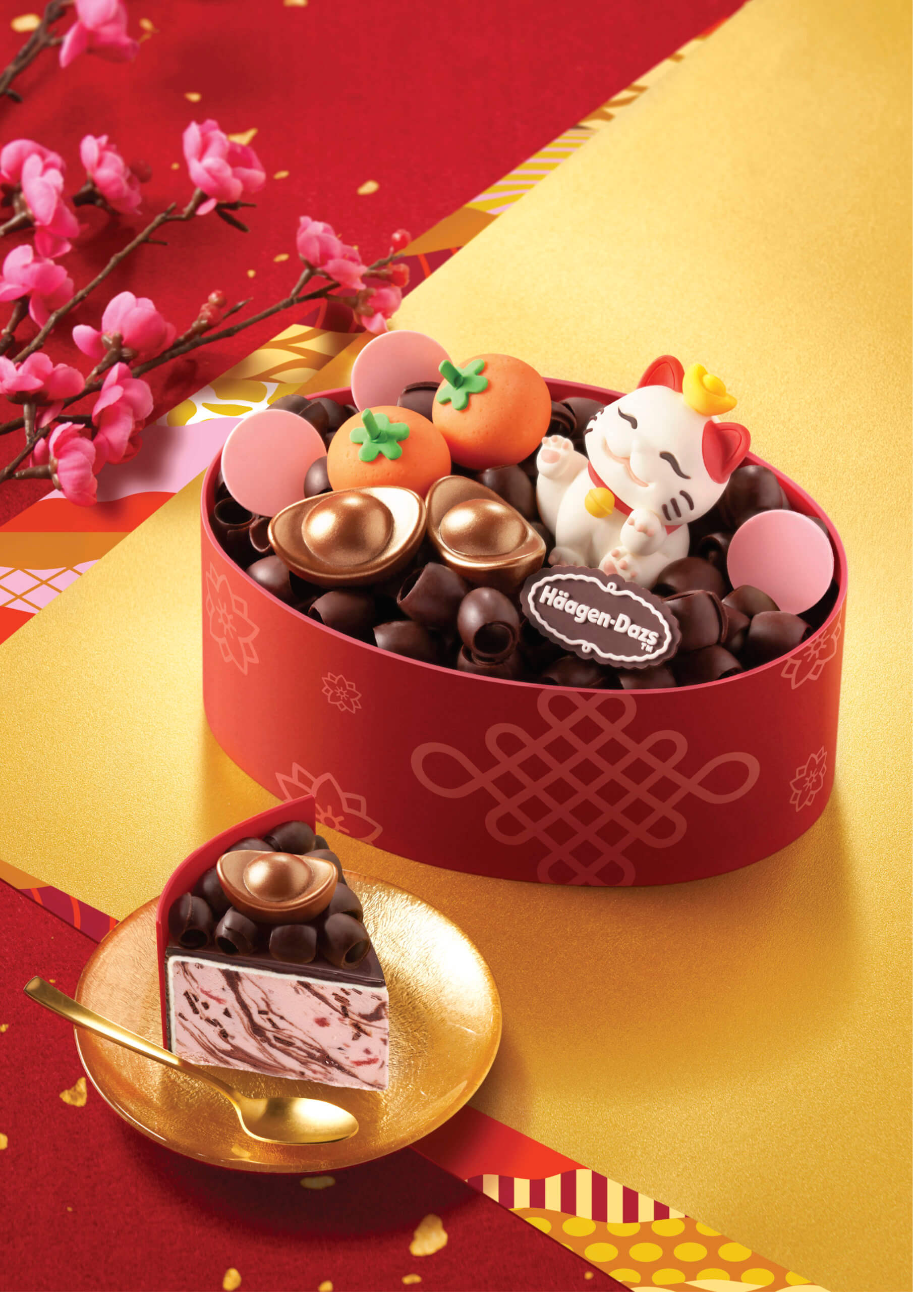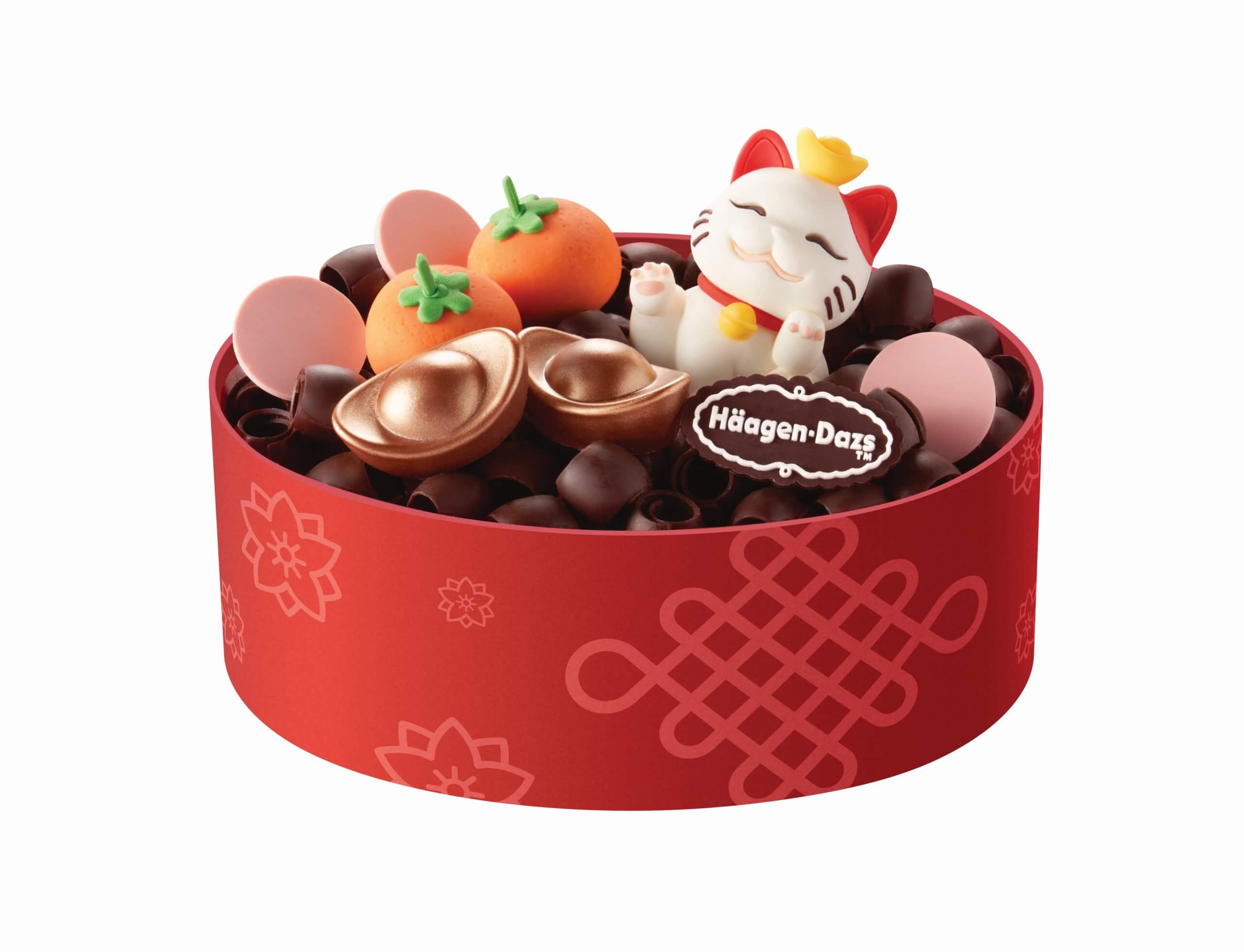 整個雪糕蛋糕猶如過年糖果盤一般,載滿了朱古力,生動的招財貓裝飾朱古力樂於其中並超萌地向大家招手,蛋糕面更放有金元寶及年桔等裝飾朱古力,帶出濃厚的農曆新年氣息,更寓意吉祥如意,盤滿缽滿,財源滾滾,一起Make a New Year Wish!Häagen-Dazs™首次推出以農曆新年作主題的雪糕蛋糕,讓大家於選賀年送禮多一個選擇,拜年時也不忘打卡,在傳統節日增添一份樂趣。雪糕蛋糕是朱古力x士多啤梨口味,每咬一口都感受到薄脆朱古力及雪糕這個黃金組合的魅力。今個新年帶著Häagen-Dazs™賀年雪糕蛋糕拜年,一次過滿足你打卡及拜年的需要。