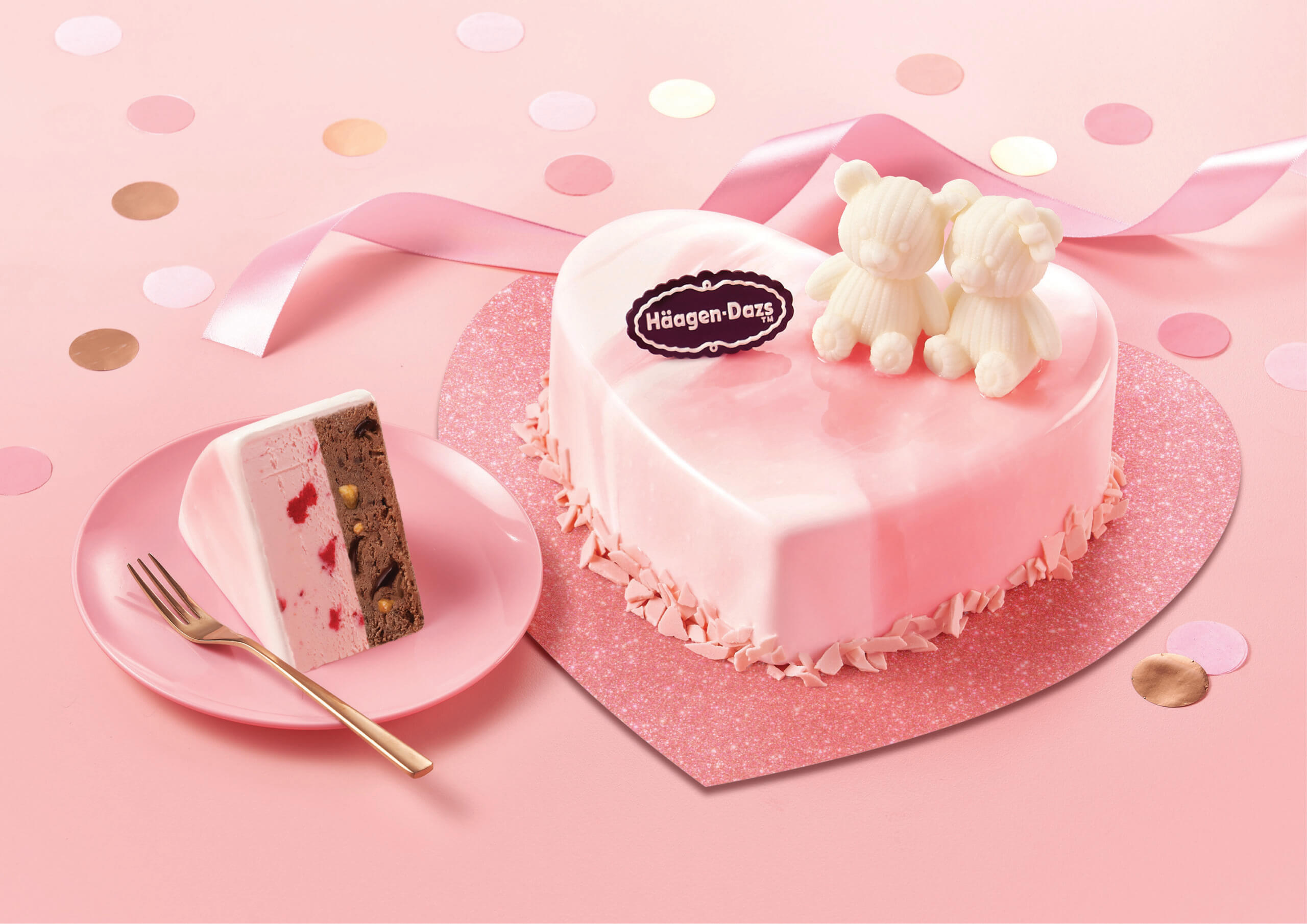 全新推出的「熊粉愛侶」雪糕蛋糕以心型粉紅雲石鏡面作設計,配上一對情侶小熊作裝飾,再以粉紅朱古力片撒在蛋糕邊,如同走進一個夢幻的粉紅世界,充斥著甜蜜的氣氛。蛋糕內有雙層雪糕 – 士多啤梨及黑朱古力杏仁口味,給予你雙層口感的極致享受,加上浪漫粉紅絕對可以攻陷愛侶的心。
