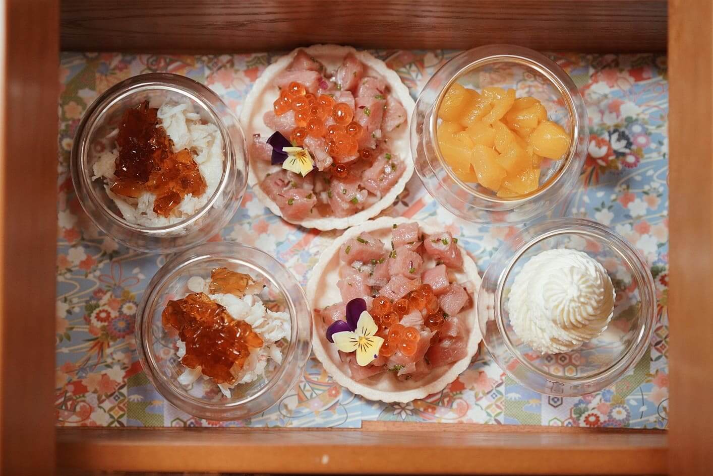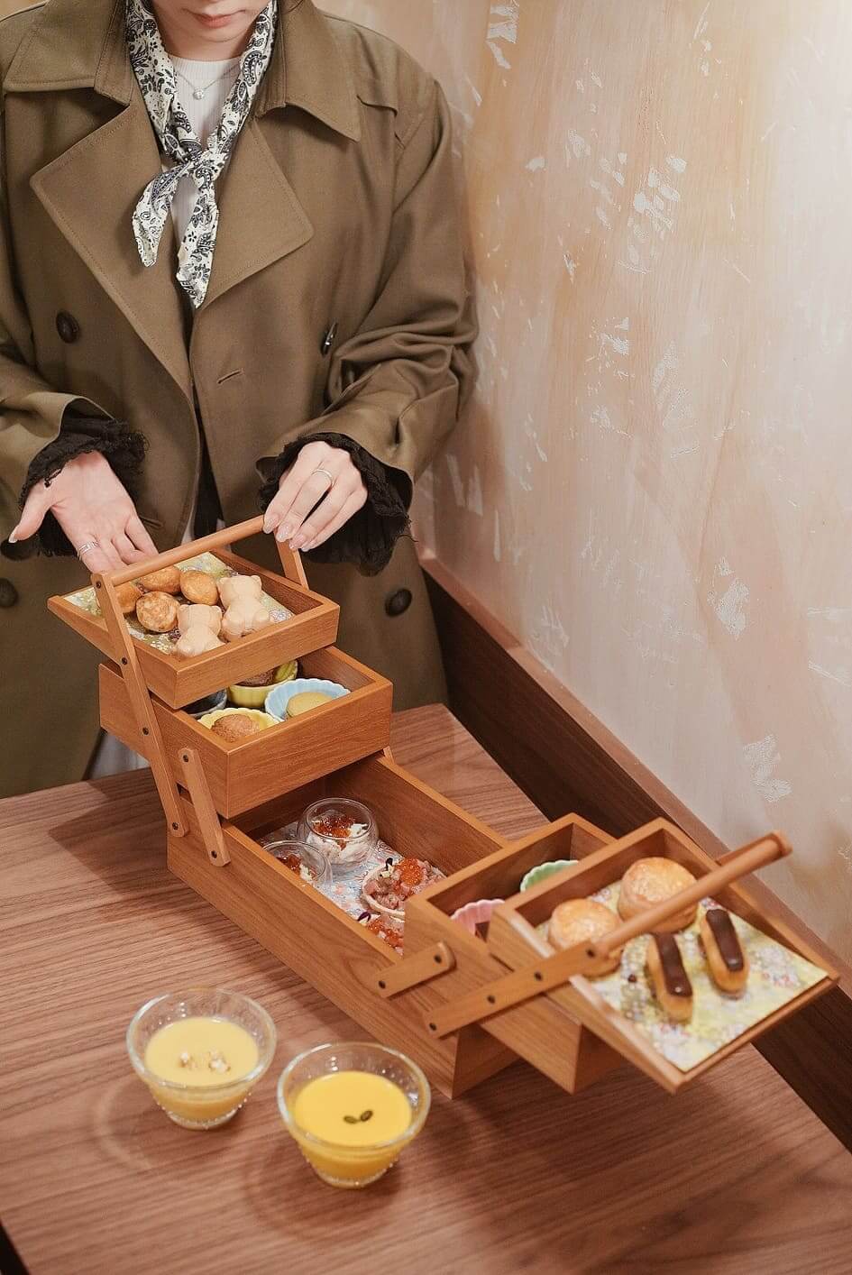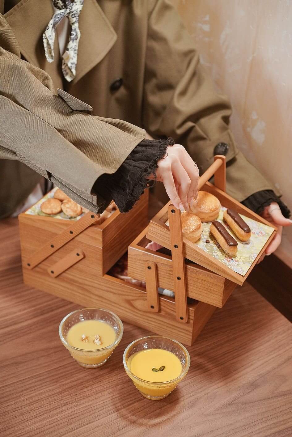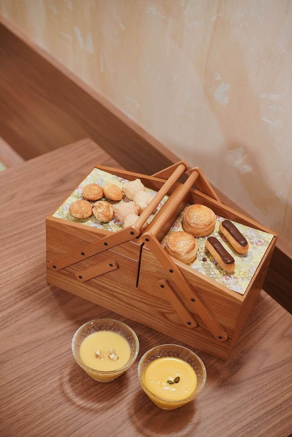 超鍾意呢個下午茶套餐,木盒造型,獨特得嚟精緻!入面有香蔥吞拿魚他他配三文魚籽、蟹肉配柚子啫喱、熊仔最中餅鵝肝慕絲等鹹點,又有馬卡龍、朱古力閃電泡芙、泡芙、瑪德蓮、scones、紅桑莓芝士蛋糕、迷你檸檬撻,仲包2碗湯(玉米奶油湯/ 南瓜奶油開心果湯)及飲品,幾豐富!
