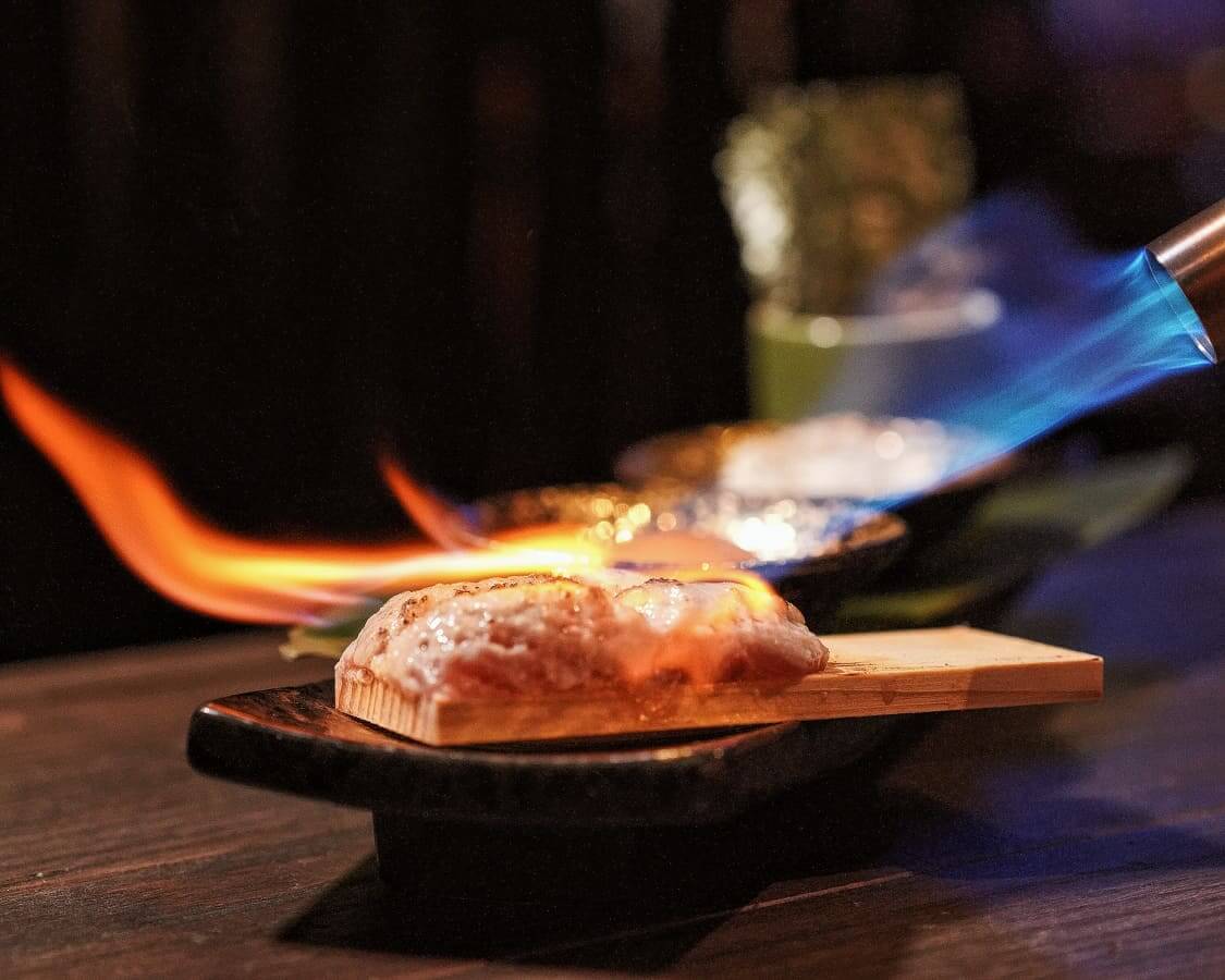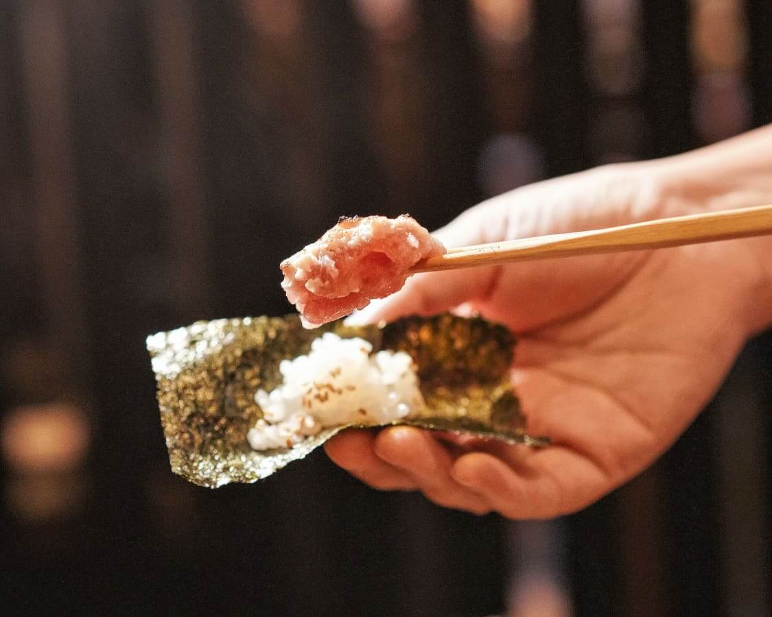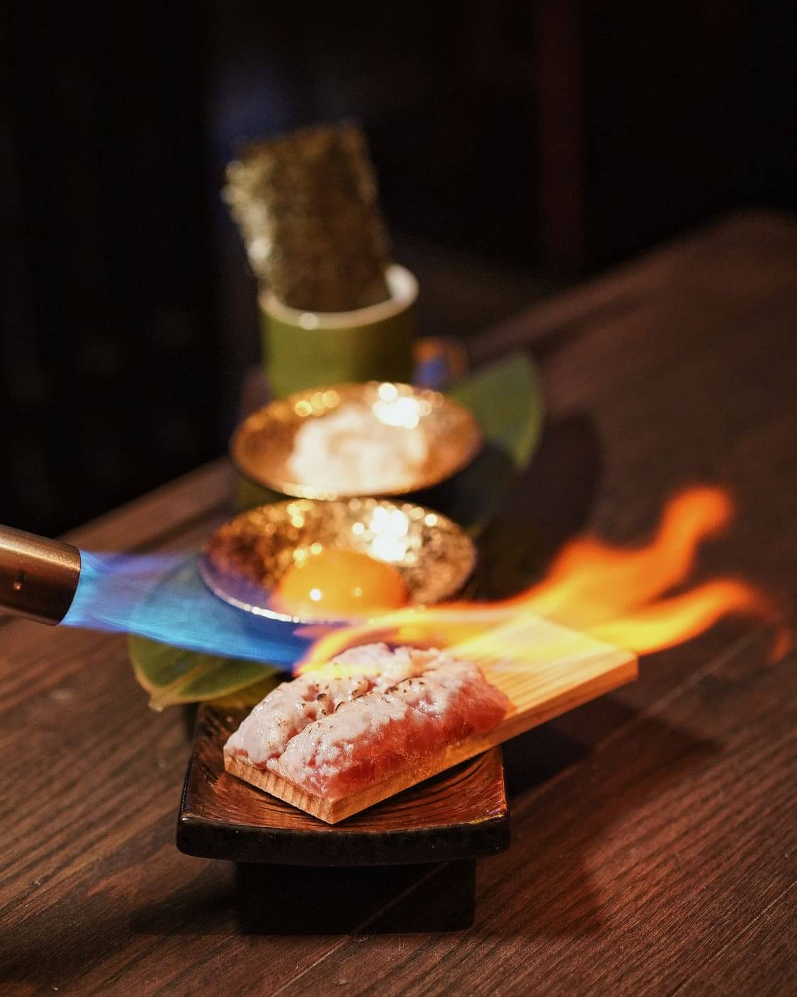 唔淨止食,店家係經典中都不乏創新,獨創DIY壽司卷物。好似「火炙蔥吞拿魚腩」,係日式托盤上放咗紫菜、蛋黃、白飯及蔥吞拿魚腩,食客可以按照自己喜好,任意搭配並放置食材係紫菜上,用手輕輕一卷,一道美食即準備就緒,好玩又好味!