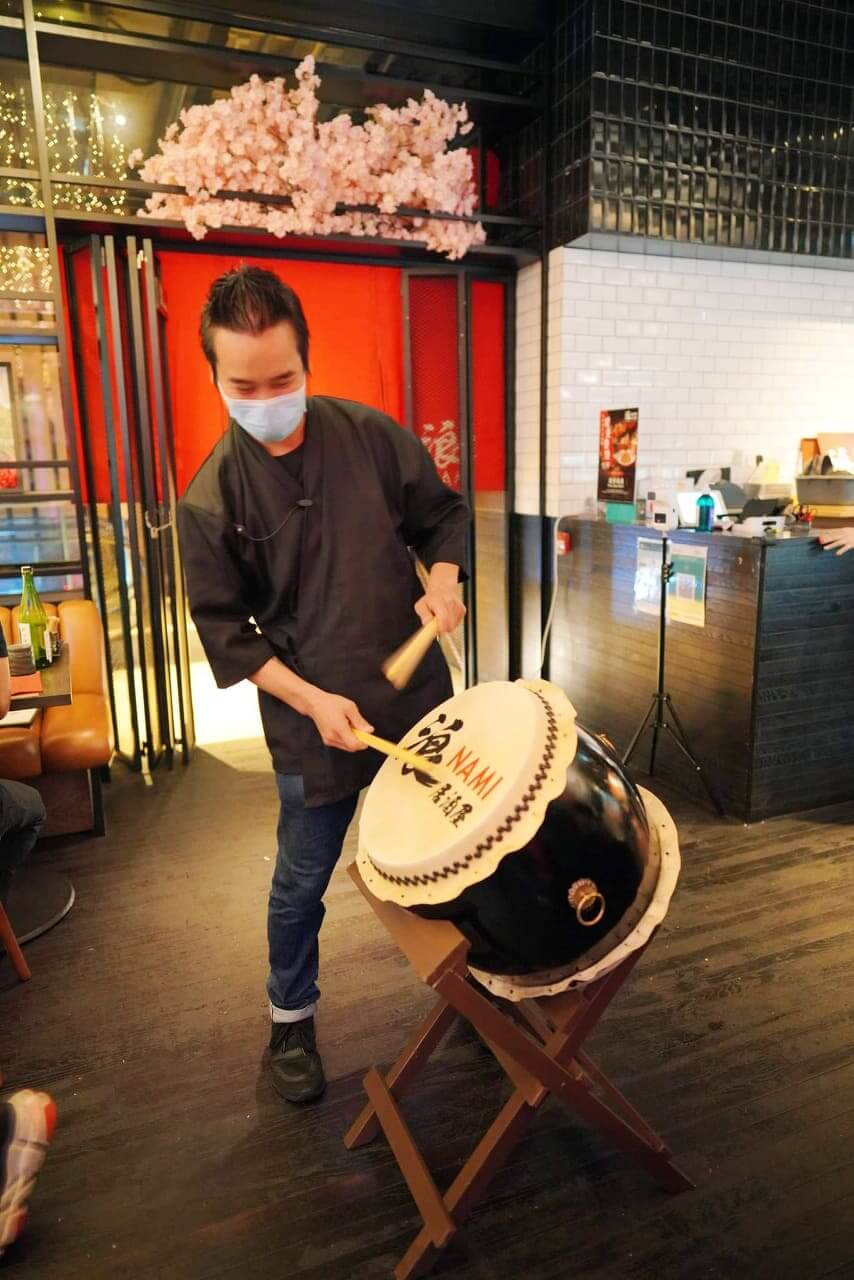 Nami浪‧居酒屋為打造日本祭典般嘅熱鬧氣氛,每晚8點,店員都會揮起鼓棒擊鼓,向每位食客贈送清酒助興,係主持人嘅帶領下,全場祝酒同歡,場面熱鬧!