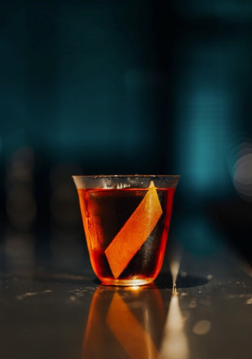 更特意將 Americano 雞尾酒的檸檬片裝飾換成半片香橙,讓人鑒別這是他調製的新雞尾酒。這杯專為
