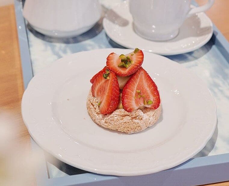 酸甜嘅士多啤梨配上蛋白脆餅,口感唔錯,中間仲有開心果慕絲,堅果香濃郁,食完唔覺得膩。