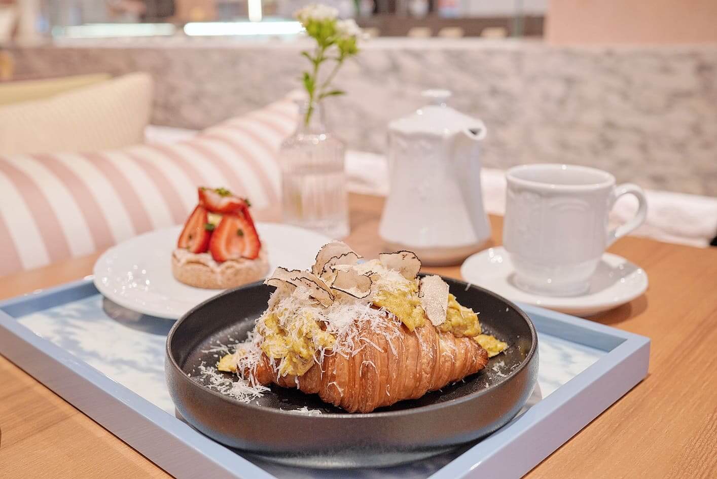 餐廳提供一系列全日早餐,當中一定要試招牌嘅松露炒蛋牛角包。喺嫩滑嘅炒蛋上,放滿即刨松露片,松露味濃郁,加上香酥鬆軟嘅巨型牛角包,足料又高質!