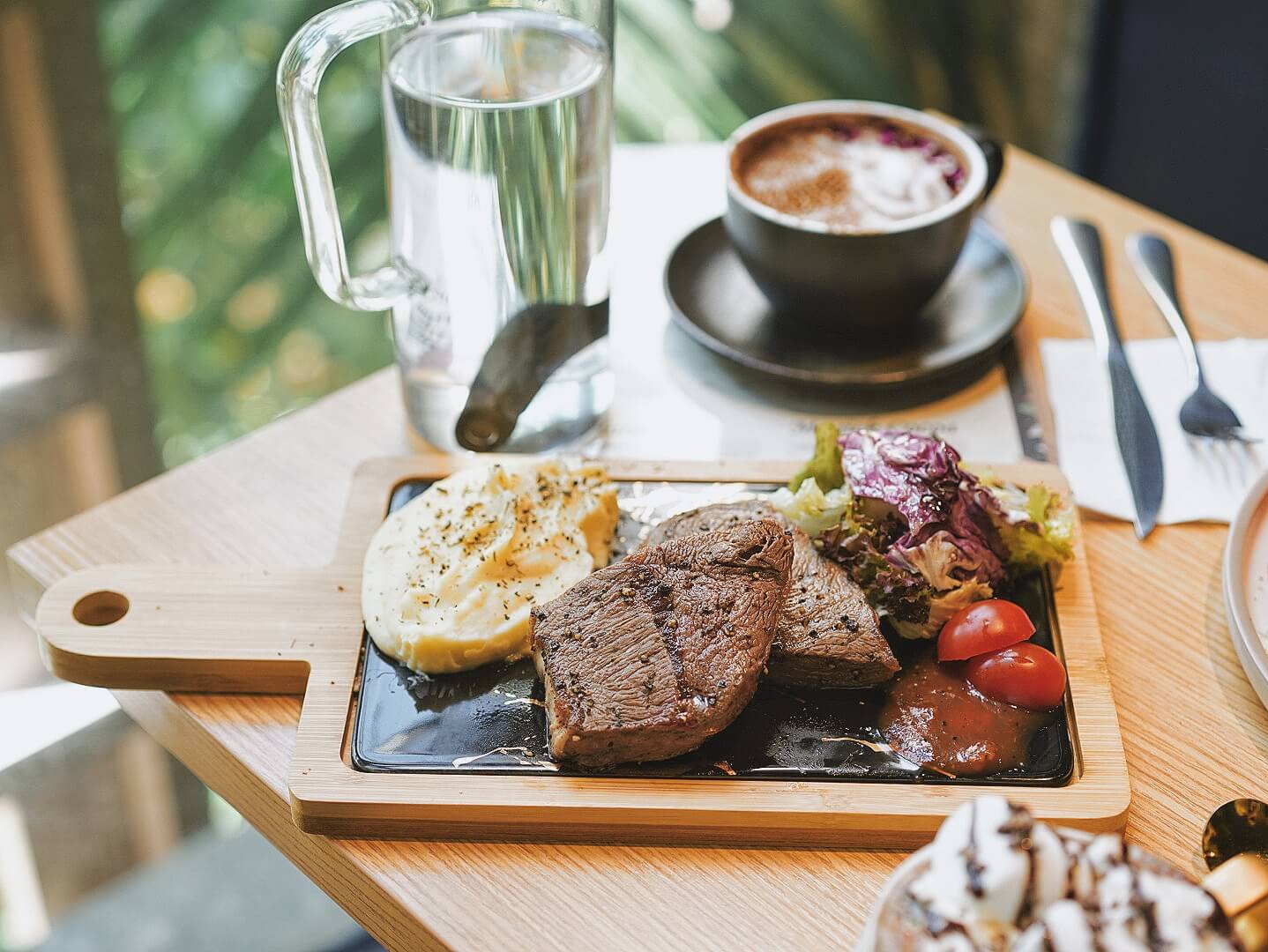 與中環店一樣,殤城逆流食物一貫高質,不走和風路線,料理較為西式,餓可揀份量大啲嘅牛扒餐或嘗招牌All Day Breakfast,口痕歎份手工蛋糕都係唔錯選擇。另外,特飲都好有詩意,以不同經典電影為靈感打造,好似《北非諜影》嘅Mocha系列、《阿甘正傳》嘅Cocoa系列、《驕陽似我》嘅Milkshake系列……充滿藝術氣息,加上窗外綠意盎然嘅樹景,別有一番風味。