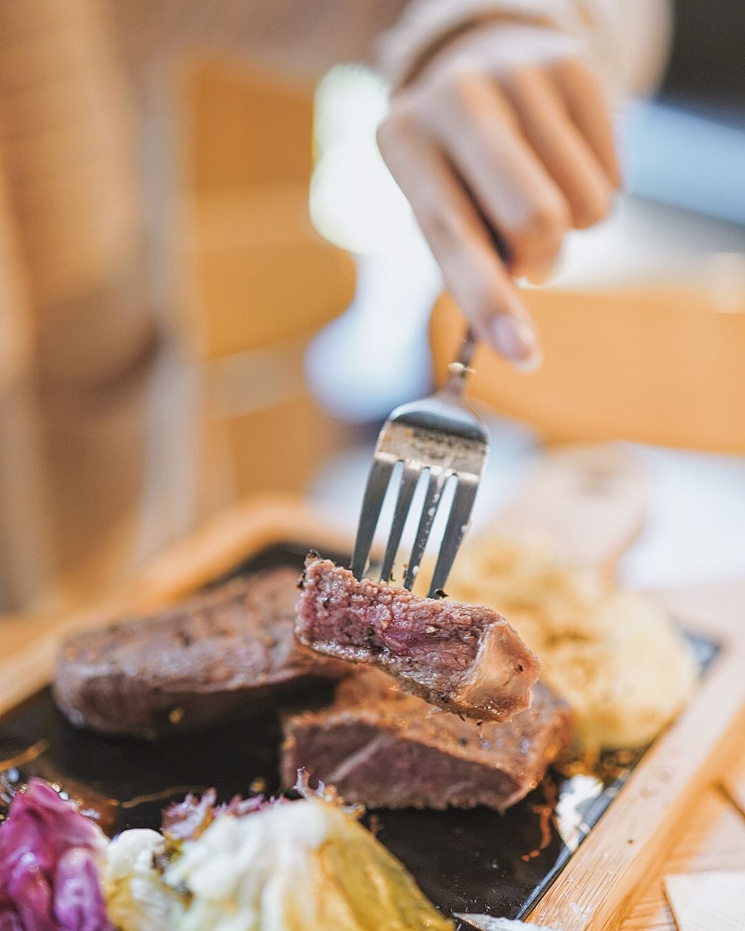 可揀Augus或US Prime牛,今次我哋就揀Augus。牛肉較少脂肪,食上口肉味較濃,5成熟唔韌又Juicy,兩大塊,份量不少!
