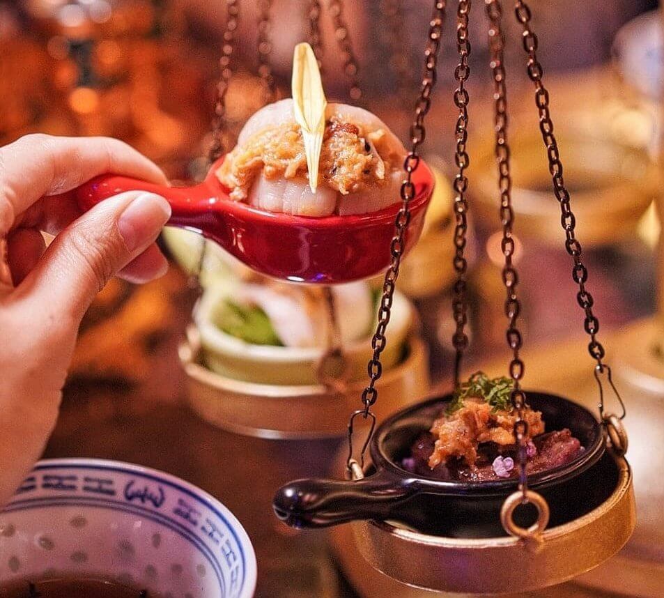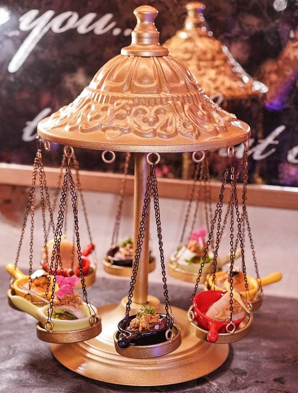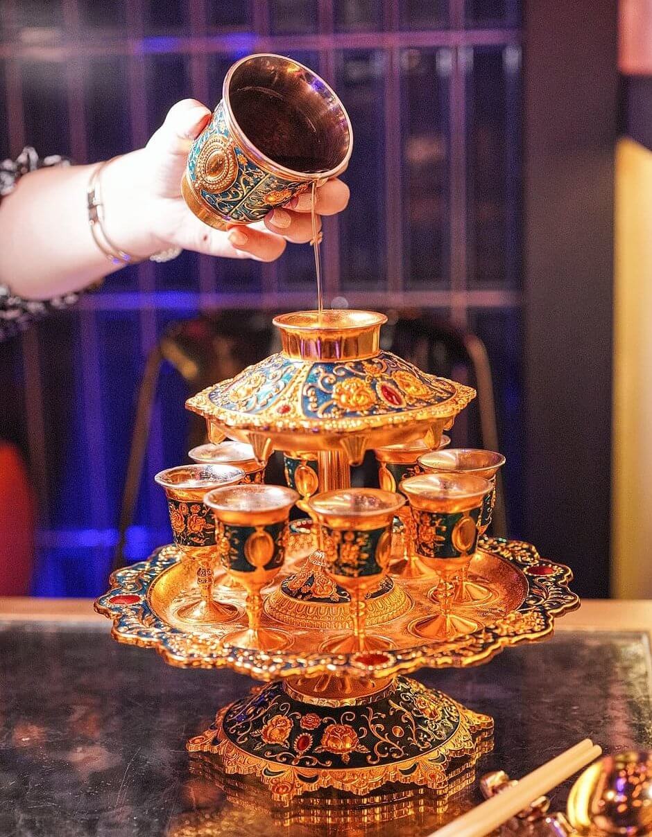 除咗蟹粉吊架,另一款造型超靚嘅就係呢款花雕酒架Set!將頂層嘅花雕酒倒向酒架中嘅洞口,花雕酒會緩緩落下,分別流入8隻裝有不同配料嘅酒杯中。因著配料嘅不同,花雕酒都會呈現不同口味。