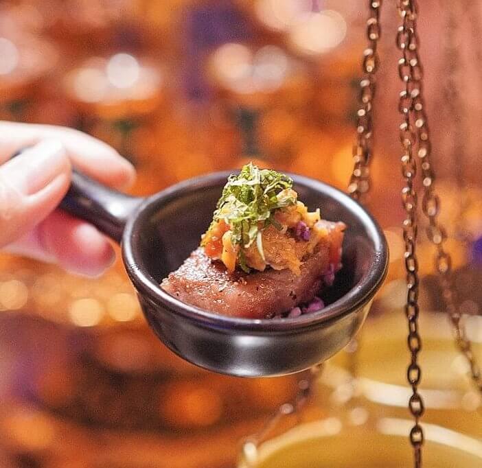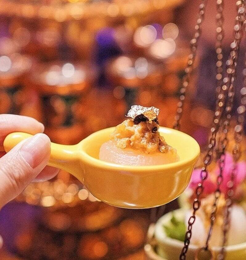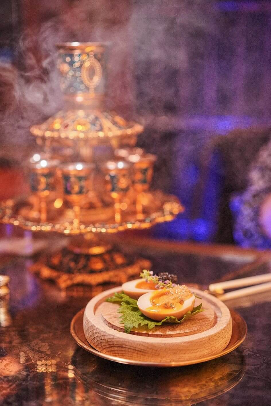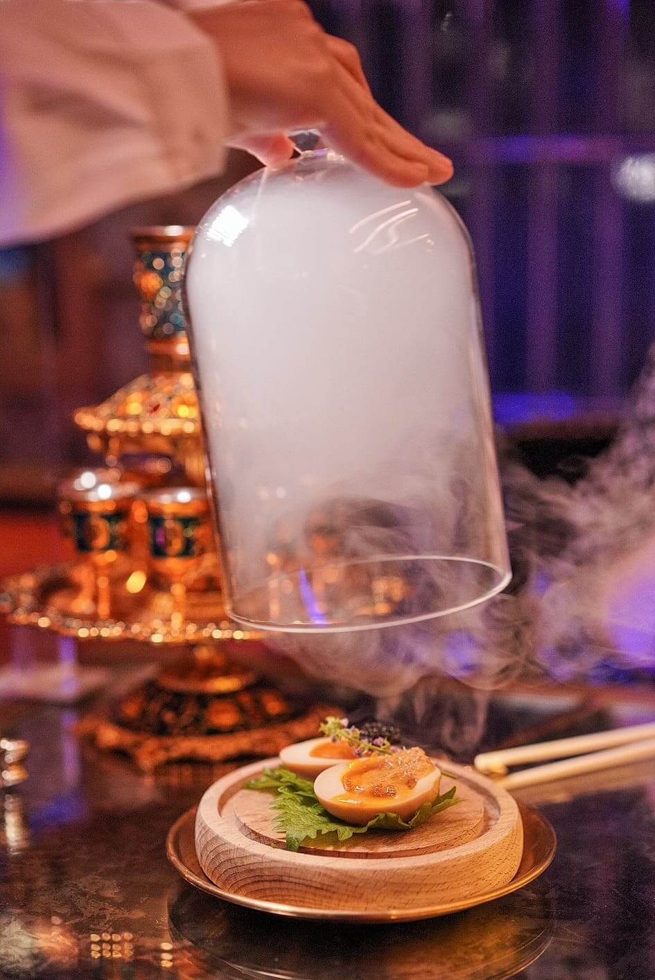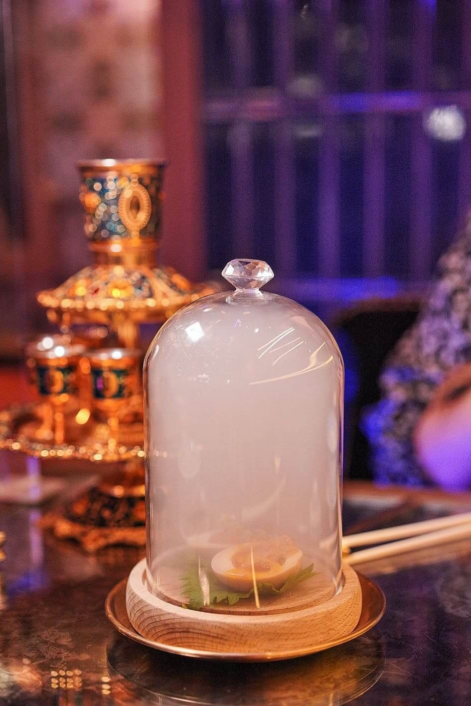 另一道小編推介,就是蟹粉煙燻鴛鴦溏心蛋!上枱時,菜式會以玻璃罩蓋好,打開一刻,煙霧迷漫,打卡效果一流!溏心蛋經過紹興酒浸泡,啖啖酒香,再加上蟹油及魚子醬,口感豐富。