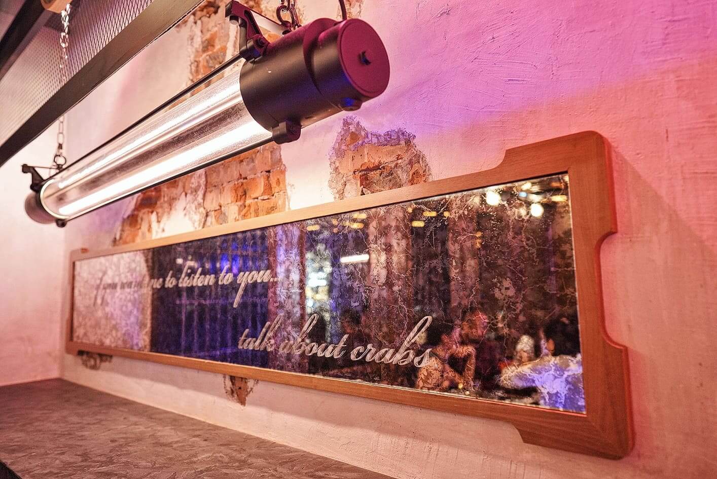 為咗重現食蟹風尚,Sexy Crab以30年代老上海酒廊為題,如桃木特製餐桌椅組、仿鏽鏡牆、鏡面天花、寶藍窗簾及粉紅霓虹燈等,懷舊與時尚兼容。