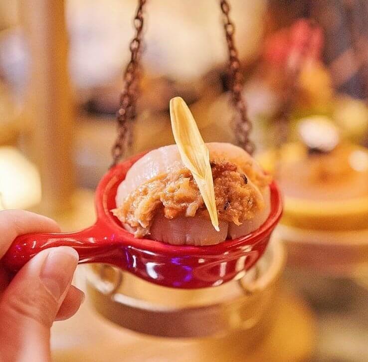 一個吊架共有四款蟹粉點心,每款各2粒,包括燒和牛配蟹粉、風呂吹大根配蟹粉和魚子醬、慢煮赤雞胸海膽卷配蟹粉,以及花雕鮮帆立貝配蟹粉。其中,我最愛燒和牛配蟹粉,半生熟和牛,肉味濃郁嫩滑,表面燒得脆口,加上鮮味蟹粉,一鮮一香,口感好正!其次,花雕鮮帆立貝配蟹粉都不錯,帆立貝半生熟,啖啖肉,肉中滲透濃濃嘅花雕酒酒香,與蟹粉好襯!