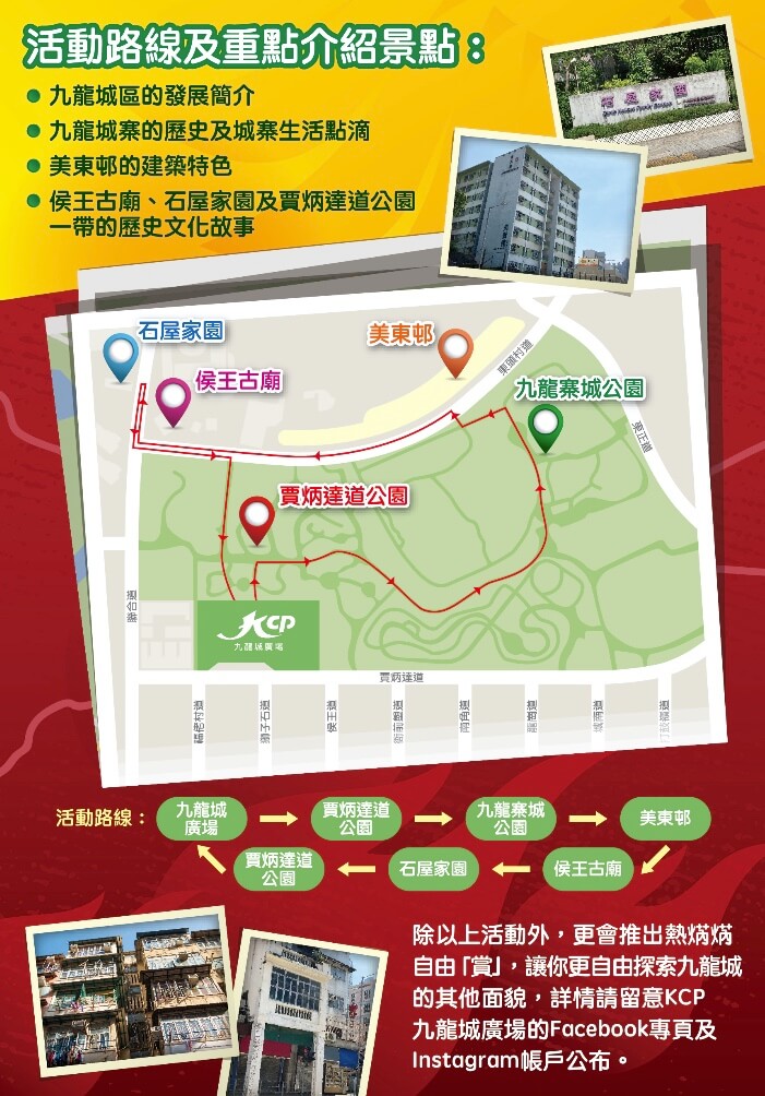 想在炎炎夏日來個輕鬆本地「深度偽旅行」?不妨到充滿社區特色的九龍城走一趟,探索城中瑰寶。旅程可以KCP九龍城廣場作起點,於推廣期內由深諳區內文化的導賞員介紹各鄰近景點,然後你可隨心計劃自由行路線,遊歷九龍寨城公園古蹟,探索城寨軼事秘聞,道別即將重建的特色公屋美東邨,追蹤昔日大戲院和首個香港電影製片廠的舊址,以及走訪侯王古廟、石屋家園和賈達道公園等等。