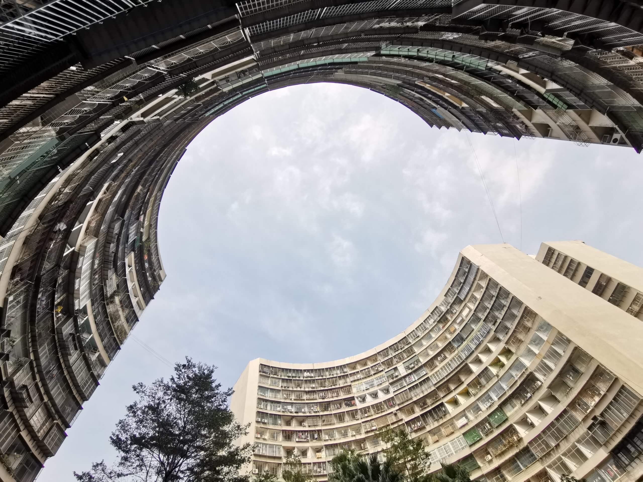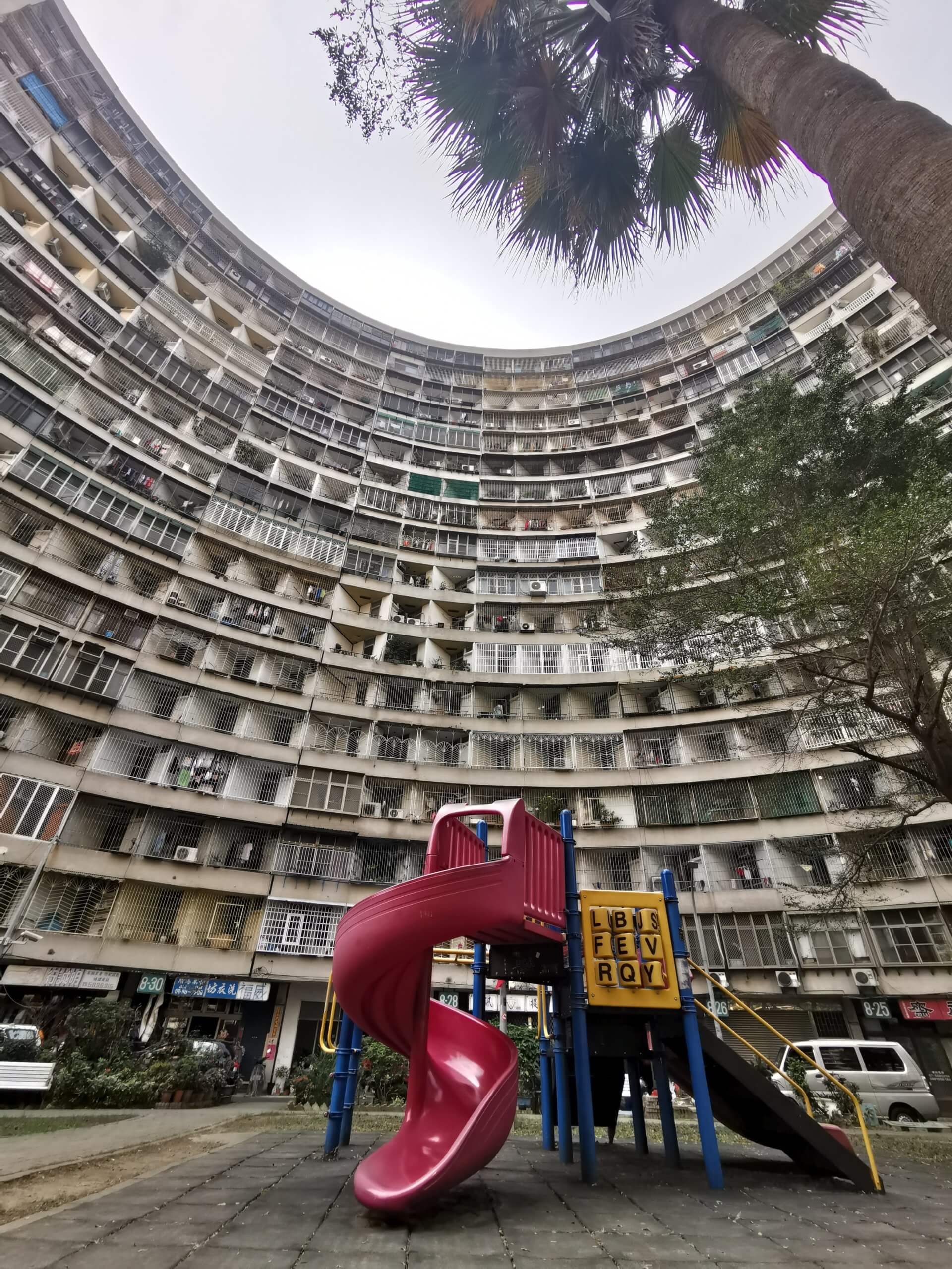 比如位於高雄左營的果貿社區(又名果貿新村),村內大樓與香港的蜂窩式住宅相似,單位密度極高,所以別稱「高雄小香港」。不過,對比香港的怪獸大樓,這邊的設計就較為跳脫,不會方方正正、四平八穩,反而呈圓弧形,其中特別是果峰街的第8、第9棟大樓,兩座圓弧大樓並立成一個圈狀,走入其中,好似闖入《Interstellar》中的殖民太空船感覺,科幻味十足!